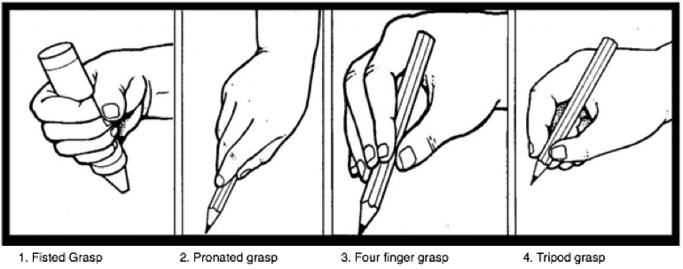 Unfortunately, pencil grasp development continues to be negatively impacted as children are exploring less with crayons and pencils, and spending more time on tablets. Yet early experience with writing tools is imperative for grasp development. The natural progress in grasp development includes a fisted grasp (one year to 18 months), a pronated grasp (two years), a four finger grasp (three to four years), and finally a tripod grasp should be developed by the age of five (see picture). A tripod grasp is the most functional grasp that allows for greater precision to button and to control the pencil.